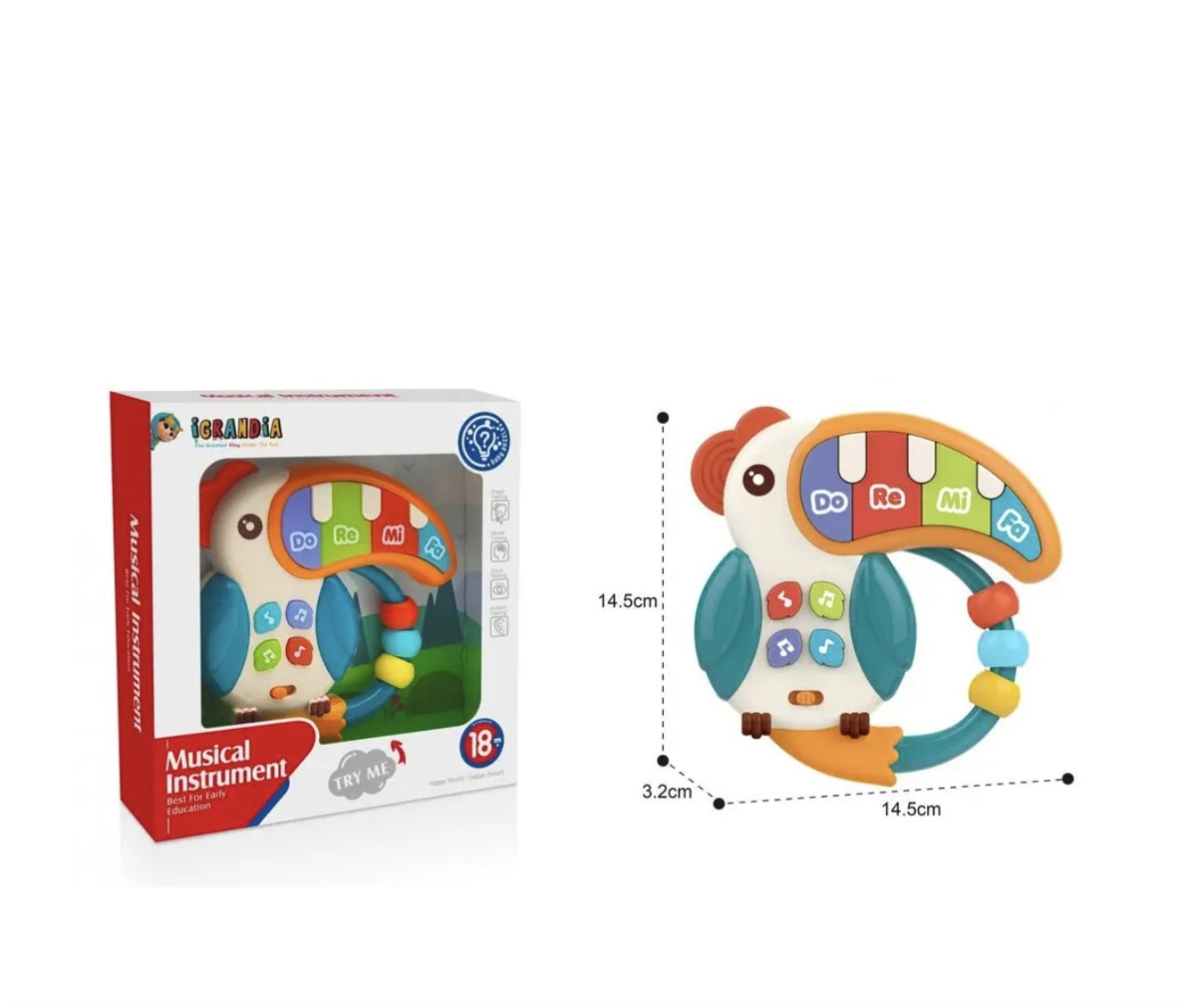 Igračka muzički papagaj sa osam tipki koje proizvode različite tonove, pogodna je za audio-vizuelni trening i trening mentalnih sposobnosti.