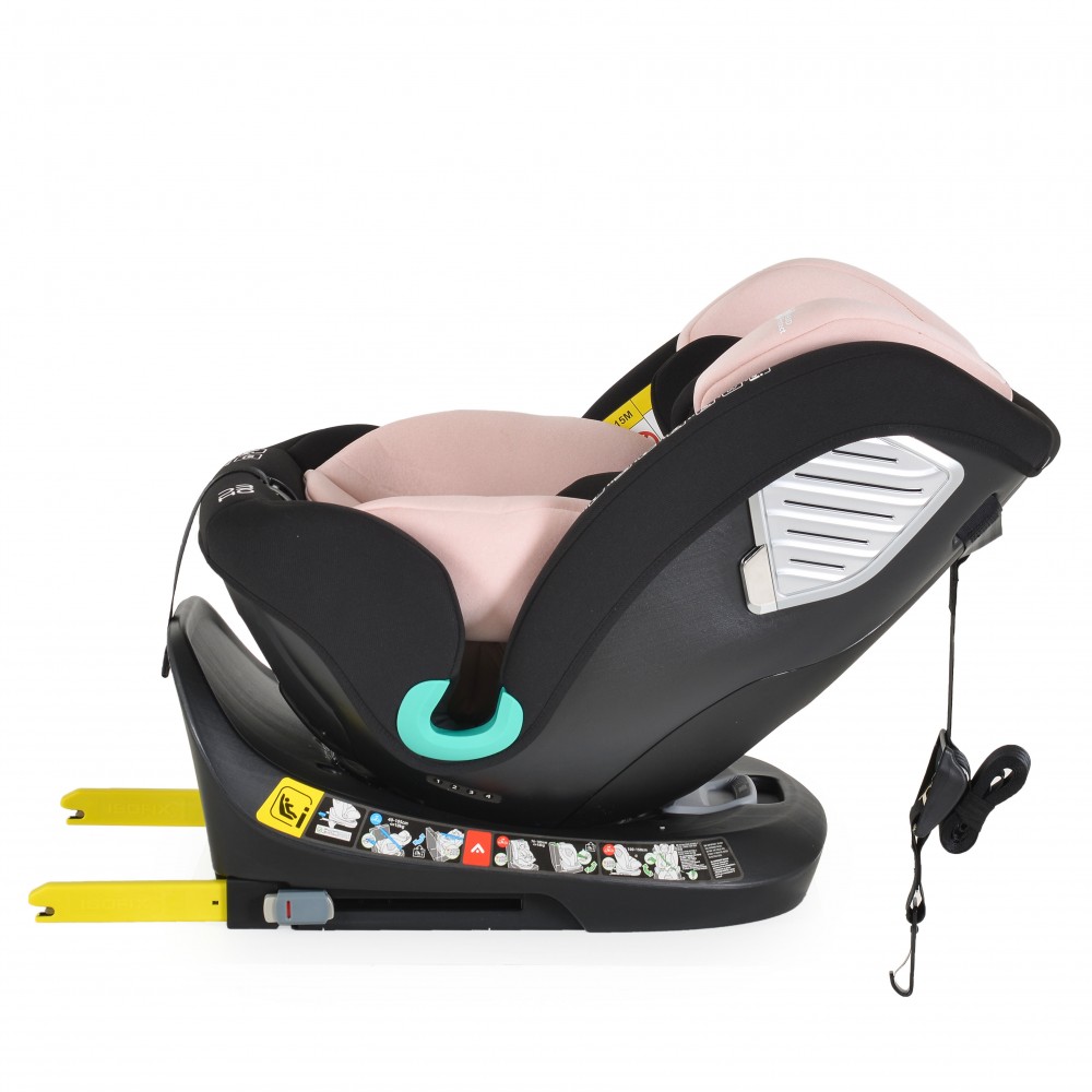 I-SIZE, 40-150 cm, ECE R129/03; Dodana isoFix funkcija i mogućnost rotacije za 360 stupnjeva, Top tether (gornja šipka) za dodatnu sigurnost; Pogodno za korištenje u suprotnom smjeru prometa od 40 do 105 cm; Pogodno za korištenje u smjeru vožnje od 76 do 150 cm; Podesiv nagib sjedala u suprotnom smjeru prometa i u smjeru prometa; Rotacija sjedala za 360 stupnjeva; SPS – Dopunski sustav bočne zaštite od udara; Podesiv naslon za glavu po visini; Sigurnosni pojas u 3 točke s mekim jastučićima za ramena; Podešivač pojasa; Mekan i udoban jastuk za veću udobnost; poklon za dijete, mekana plišana igračka i jastuk za dodatnu udobnost djeteta tijekom spavanja
