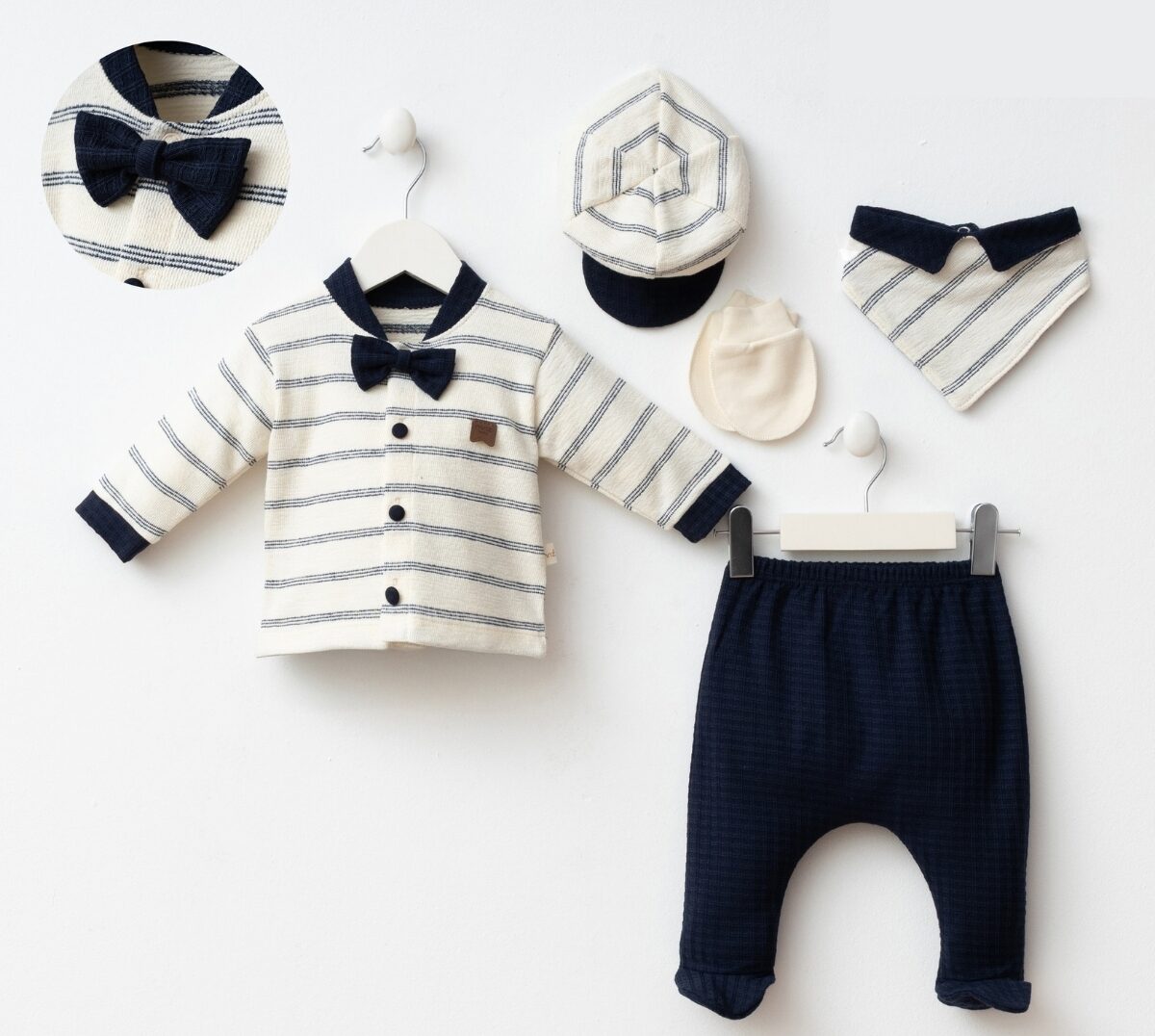 Pamučni kompletić za dječake.Dolazi iz 5 djelova majca,hlače,kapa,siper i rukavice.